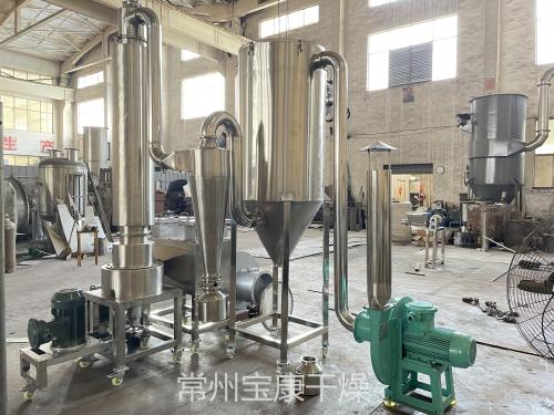 设备结构与工作原理 1. 核心系统构成 闪蒸干燥机由五大系统协同工作: 系统名称 | 主要组件 | 功能特点 | 热风系统 | 空气过滤器、加热器、热风分布器 | 提供洁净热风,切向进风形成螺旋上升气流 | 干燥主机 | 干燥室(锥形/筒形)、搅拌装置 | 核心干燥区,底部设置破碎装置和冷却保护 | 分离收集系统 | 旋风分离器、布袋除尘器、引风机 | 气固分离,尾气达标排放 | 进排料系统 | 螺旋加料器、闭风器 | 连续稳定供料,维持系统负压 | 控制系统 | PLC、传感器、执行机构 | 温度、压力、转速多参数联动控制 |